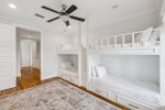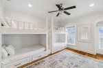 Moving up to the third floor, there are two additional bedrooms. One King room with one private Juliet balcony, one shared balcony, and an en-suite bathroom with a glass shower. The last is a bunk room with two sets of built-in Twin-over-Twin bunks, a shared balcony, and a spacious en-suite bathroom with dual vanities, a large glass shower, and a separate soaking tub.