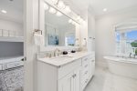 - Bedroom 1 (Master): King bed, 2 balcony accesses, en-suite bathroom with dual vanities, glass shower, + separate soaking tub