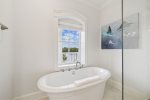 - Bedroom 4: Bunk room with two sets of Twin-over-Twin bunk beds, balcony access, en-suite bathroom with dual vanities, glass shower, + separate soaking tub