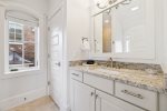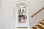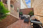 The home sits elevated above street level and offers two entry points—either through the dining room or through the living room via a charming private brick courtyard. The courtyard features a cozy outdoor sofa, a fire table, and a BBQ grill, creating the perfect space to cook up delicious meals or unwind after a day at the beach.