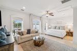 Located above the garage, the separate carriage house is perfect for added privacy. It includes a kitchenette, a living area with a Queen-sized sleeper sofa, a private balcony, and a King bed with an en-suite bathroom with a glass shower.