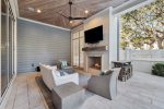 Outside, you'll love the private backyard retreat. The pool features a stunning built-in fire table, creating the perfect spot for both daytime lounging and cozy evenings under the stars. There is also a full summer kitchen, with a built-in grill, sink, mini fridge, and ample cabinet space, making it easy to enjoy meals outdoors. Make your way over to the covered deck, and you'll find an outdoor fireplace, TV, and tons of cozy seating.