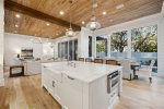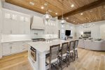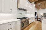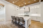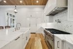 Stepping inside, you're greeted by a bright and open living, dining, and kitchen space. The living room features large glass doors that open up to the covered outdoor deck, bringing in tons of natural light. The kitchen is a chef’s dream, complete with white marble countertops, dual ovens, a 6-burner gas stove with part flat top, beautiful white cabinetry, and seating for 4 at the island. Just off the kitchen is the dining area with a gorgeous wood table that seats up to 10— perfect for shared meals and late-night games!