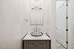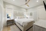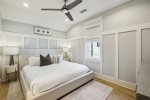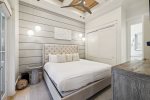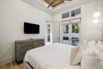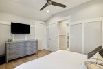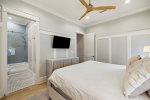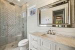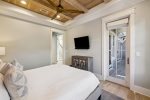 Just off the main area is a half bathroom, as well as the first bedroom which has a King bed, direct access to the pool deck, and a private en-suite bathroom with a glass walk-in shower.