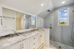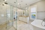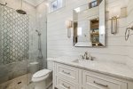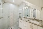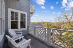 The other two bedrooms on the second floor both have King beds, one with access to a shared balcony and an en-suite bathroom with a walk-in shower, and the other with an en-suite with a shower/tub combination.