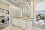 - Bedroom 2 (Master): King bed, built-in fireplace, private balcony, walk-in closet, private washer/dryer, en-suite bathroom with dual vanities, walk-in glass shower with dual showerheads, separate soaking tub