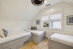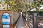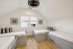 Moving up to the third floor, a third living room with a wet bar provides even more space to spread out, and the final three bedrooms are also on this floor. The first is a King bedroom that shares a hallway bathroom with dual vanities and a glass shower. The second bedroom, featuring four built-in Full beds and a private balcony with Gulf views, also shares this hallway bathroom. The last room has three Twin beds + one Full bed, and an en-suite bathroom with dual vanities and a glass shower.
