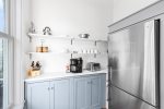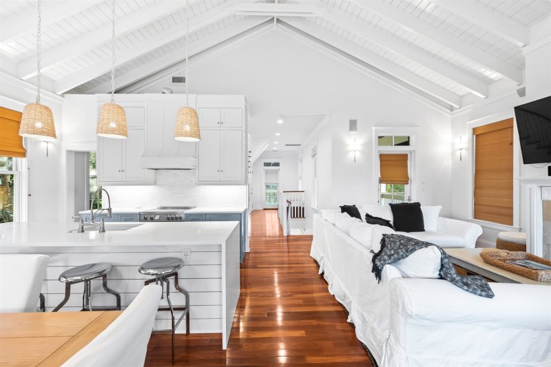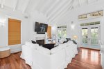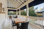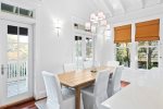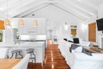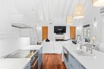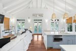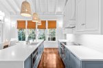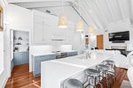 Upstairs on the second floor is the heart of the home, a bright and open living room filled with natural light, tall windows, and a second cozy fireplace. Step out onto the wraparound balcony and enjoy an outdoor dining table, balcony swing, and additional seating, perfect for enjoying those coastal breezes! Just beyond the living room, there’s a large dining table for 6, along with the gourmet kitchen that is fully equipped with stainless steel appliances, custom cabinets, and bar seating for 4.