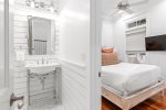 Also on this floor is a third bedroom with a Queen bed, which opens up into a cozy area with a Twin daybed and access to the balcony. These two spaces both share a bathroom with a glass shower.