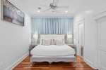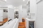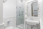 Step inside and you’re greeted by a warm, inviting living room with coastal-style decor and a beautiful fireplace. Just past the living room, you’ll find a convenient wet bar perfect for grabbing drinks on your way to the pool. Also on the first floor, you’ll find the laundry room along with two spacious bedrooms. The first is the master bedroom featuring a King bed and an en-suite bathroom with dual vanities, a glass shower, and a separate soaking tub. The second bedroom also has a King bed and shares the first-floor hallway bathroom with a large glass shower with a built-in tub.