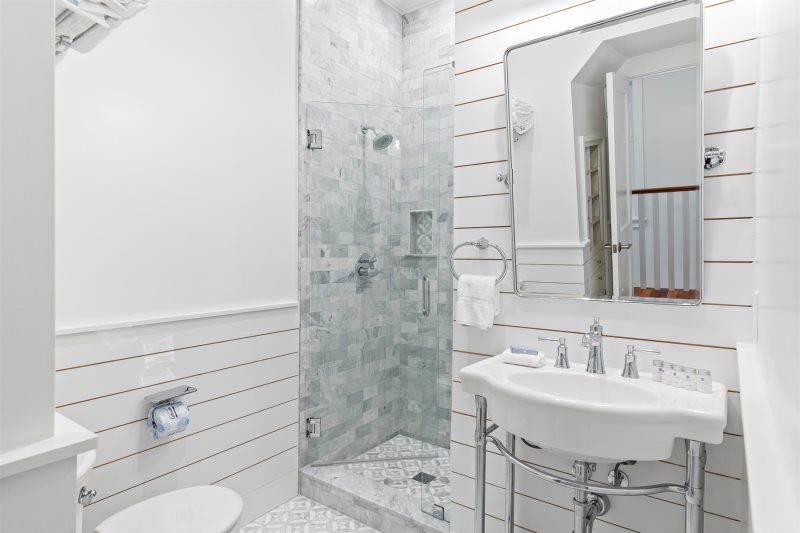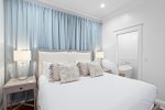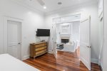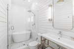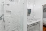 - Bedroom 2: King bed, shared hallway bathroom with large glass shower with built-in soaking tub