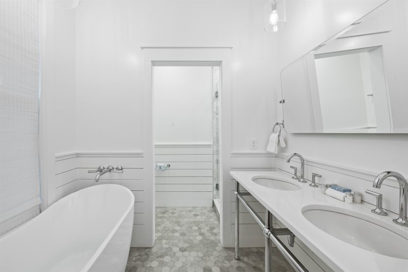 - Bedroom 1 (Master): King bed, en-suite bathroom with dual vanities, glass shower, and separate soaking tub